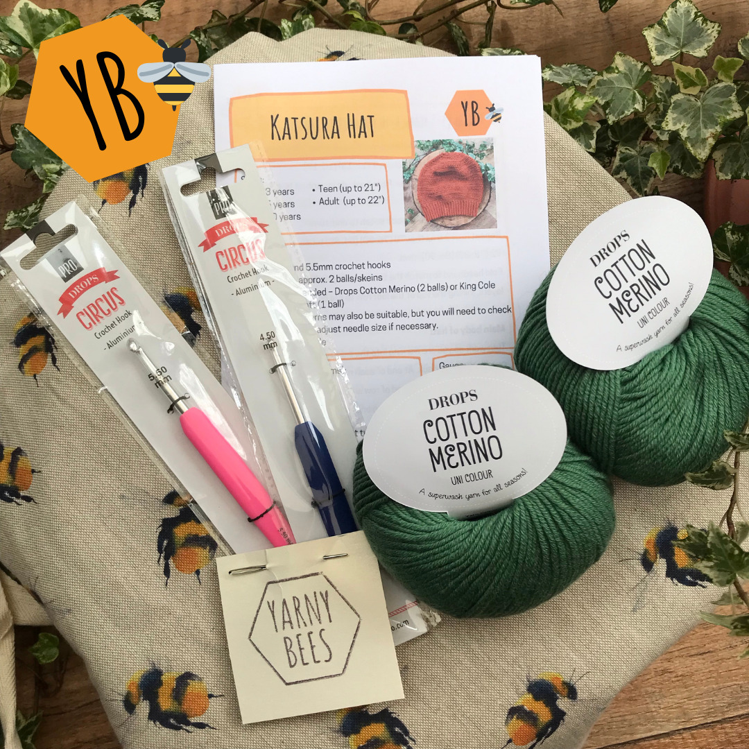 Full kit contains: Digital copy of Katsura hat pattern, four balls of Drops Cotton Merino yarn (your choice of colour(s)), one 5.5mm crochet hook, one 4.5mm crochet hook, one tapestry needle, one handmade bee print project bag (optional extra)